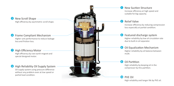 Scroll kompresör, tüm kompresörün performansını mükemmel şekilde artıracak olan FCM (Çerçeve Uyumlu Mekanizma) olarak adlandırılan mükemmel bir mekanizmaya sahiptir. Isıtma performansı artacaktır çünkü kompresörün kütlesinde depolama ısısı vardır, örneğin motor, kompresör kabuğu. Depolama ısısı, kompresörün sıcaklığının düşürülmesi veya aşırı ısınmanın optimum sıcaklığa düşürülmesi ile yoğuşmaya taşınabilir. Tüm bunlar, spiral kompresörün kapsamlı rekabet gücünü artırır.